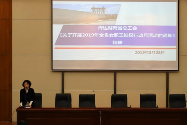女工委员杨剑锋老师传达了湖南省总工会《关于开展2019年全省女职工维权行动月活动的通知》。