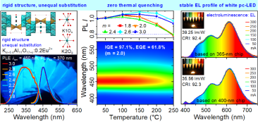 图片截自文章Chem. Eng. J. 2022, 429, 132225的TOC 23)Shi R.; Zhang X.; Qiu Z.; Zhang, J.*; Liao S.; Zhou W.; Xu X.; Yu L.; Lian S.*, Composition and anti-thermal quenching of non-integer stoichiometric Eu2+-doped Na-beta-alumina with cyan emission for near-UV WLEDs. Inorg. Chem. 2021, (accepted on 2021-11-29). 22)Liao, S.; Zhang, Y.; Li, Y.; Zhang, J.*; Chen, Z.; Yi, B.*, Tuning crystal structure and luminescence of Eu2+-activated LiSr1–xBaxPO4 solid solution for white light-emitting diodes. Mater. Adv. 2021, https://doi.org/10.1039/D1MA00950H. 21)Wu, X.; Ji, X.; Wang, Z.*; Qiu, Z.; Yu, L.; Zhou, W.; Zhang, J.*; Lian, S., Improving thermal stability and quantum efficiency through solid solution for Ce3+-activated (Ba1-xSrx)3Y2(BO3)4 phosphors. J. Alloys Compd. 2021, 855, 157520. 20)Zhang, X.; Zhang, J.*; Wu, X.; Yu, L.; Liu, Y.; Xu, X.; Lian, S., Discovery of blue-emitting Eu2+-activated sodium aluminate phosphor with high thermal stability via phase segregation. Chem. Eng. J. 2020, 388, 124289. 19)Liao, S.*; Li, Y.; Zhang, Y.; Tan, Z.; Fu, X.; Qiu, Z.; Zhang, J.*, Highly thermal stable phosphor LiSrPO4:Eu2+ with a new crystal structure. Appl. Mater. Today 2020, 21, 100792. 18)Zhang, X.; Zhang, J.*; Ma, W.; Liao, S.; Zhang, X.; Wang, Z.; Yu, L.; Lian, S.*, From nonluminescence to bright blue emission: boron-induced highly efficient Ce3+-doped hydroxyapatite phosphor. Inorg. Chem. 2019, 58 (19), 13481-13491.(被ChemistryViews报道) 17)Ma, W.; Zhang, J.*; Zhang, X.; Zhang, X.; Liu, Y.*; Liao, S.; Lian, S., Highly efficient and thermal stable La2Si2O7:Ce3+,Tb3+,Eu3+ phosphors: Emission color tuning through terbium bridge. J. Alloys Compd. 2019, 785, 53-61. 16)Li, Y.(#1); Qiu, Z.(#1); Zhang, J.*; Ji, X.; Zhang, X.*; Liao, S.; Zhou, W.; Yu, L.; Lian, S., Highly efficient and thermally stable single-activator white-emitting phosphor K2Ca(PO4)F:Eu2+ for white light-emitting diodes. J. Mater. Chem. C 2019, 7 (29), 8982-8991. 15)Ma, W.; Zhang, J.*; Zhang, X.; Zhang, X.*; Liao, S.; Qiu, Z.; Zhou, W.; Yu, L.; Lian, S., Crystallographic-site induced multi-color emission with high efficiency in Ca3(SiO3)3:Ce3+ phosphor. J. Alloys Compd. 2018, 764, 574-581. 14)Ji, X.; Zhang, J.*; Li, Y.; Liao, S.*; Zhang, X.; Yang, Z.; Wang, Z.; Qiu, Z.; Zhou, W.; Yu, L.; Lian, S.*, Improving quantum efficiency and thermal stability in blue-emitting Ba2–xSrxSiO4:Ce3+ phosphor via solid solution. Chem. Mater. 2018, 30 (15), 5137-5147.(他引次数 >100次) 13)Liao, S.*(#1); Ji, X.(#1); Liu, Y.; Zhang, J.*, Highly efficient and thermally stable blue-green (Ba0.8Eu0.2O)(Al2O3)4.575×(1+x) phosphor through structural modification. ACS Appl. Mater. Interfaces 2018, 10 (45), 39064-39073. 12)Liao, S.*; Zhang, W.; Zhang, J.*, Site-sensitive energy transfer from Ce3+ to Tb3+/Mn2+ based on an efficient phosphor Li4SrCa(SiO4)2:Ce3+. Ceram. Int. 2018, 44 (15), 18413-18419. 11)Zhang, X.*; Zhang, J.*; Chen, Y., Broadband-excited and efficient blue/green/red-emitting Ba2Y5B5O17: Ce3+,Tb3+,Eu3+ phosphors using Tb3+-bridged Ce3+-Eu3+ energy transfer. Dyes Pigm. 2018, 149, 696-706.(曾入选ESI高被引论文) 10)Zhang, J.; Zhang, X.; Zhang, J.*; Ma, W.; Ji, X.; Liao, S.*; Qiu, Z.; Zhou, W.; Yu, L.; Lian, S., Near-UV-to-red light conversion through energy transfer in Ca2Sr(PO4)2:Ce3+, Mn2+ for plant growth. J. Mater. Chem. C 2017, 5 (46), 12069-12076. 9)Zhang, J.; Zhang, J.*; Zhou, W.; Ji, X.; Ma, W.; Qiu, Z.; Yu, L.; Li, C.; Xia, Z.*; Wang, Z.; Lian, S.*, Composition screening in blue-emitting Li4Sr1+xCa0.97–x(SiO4)2:Ce3+ phosphors for high quantum efficiency and thermally stable photoluminescence. ACS Appl. Mater. Interfaces 2017, 9 (36), 30746-30754. 8)Li, M.; Zhang, J.*; Han, J.; Qiu, Z.; Zhou, W.; Yu, L.; Li, Z.; Lian, S.*, Changing Ce3+ content and codoping Mn2+ induced tunable emission and energy transfer in Ca2.5Sr0.5Al2O6:Ce3+,Mn2+. Inorg. Chem. 2017, 56 (1), 241-251.(曾入选ESI高被引论文) 7)Yi, L.; Zhang, J.*; Liu, F.; Qiu, Z.; Zhou, W.; Yu, L.; Lian, S.*, Enhancement of red emission in Ce3+, RE3+, Mn2+ codoped Ca5(BO3)3F phosphors: luminescent properties and structural refinement. J. Alloys Compd. 2016, 688, Part A, 345-353. 6)Zhang, J.*; Zhang, W.; Qiu, Z.; Zhou, W.; Yu, L.; Li, Z.; Lian, S.*, Li4SrCa(SiO4)2:Ce3+, a highly efficient near-UV and blue emitting orthosilicate phosphor. J. Alloys Compd. 2015, 646, 315-320. 5)Yi, L.; Zhang, J.*; Qiu, Z.; Zhou, W.; Yu, L.; Lian, S.*, Color-tunable emission in Ce3+, Tb3+ co-doped Ca5(BO3)3F phosphor. RSC Adv. 2015, 5 (82), 67125-67133. 4)Zhang, J.*; Zhang, W.; He, Y.; Zhou, W.; Yu, L.; Lian, S.*; Li, Z.; Gong, M., Site-occupancy on the luminescence properties of a single-phase Li4SrCa(SiO4)2:Eu2+ phosphor. Ceram. Int. 2014, 40 (7), 9831-9834. 3)Zhang, J.*; He, Y.; Qiu, Z.; Zhang, W.; Zhou, W.; Yu, L.; Lian, S., Site-sensitive energy transfer modes in Ca3Al2O6: Ce3+/Tb3+/Mn2+ phosphors. Dalton Trans. 2014, 43 (48), 18134-18145. 2)He, Y.; Zhang, J.*; Zhou, W.; Han, J.; Qiu, Z.; Yu, L.; Rong, C.; Lian, S.*, Multicolor emission in a single-phase phosphor Ca3Al2O6:Ce3+,Li+: luminescence and site occupancy. J. Am. Ceram. Soc. 2014, 97 (5), 1517-1522. 1)Zhang, J.*; Zhang, X.; Gong, M.*; Shi, J.; Yu, L.; Rong, C.; Lian, S., LiSrBO3:Eu2+: a novel broad-band red phosphor under the excitation of a blue light. Mater. Lett. 2012, 79 (0), 100-102. |