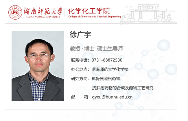 徐广宇,1999年3月获湖南大学应用化学专业硕士学位,硕士毕业后分配至湖南省轻工研究院从事科研工作, 2001年9月考入中国科学院上海药物研究所攻读博士学位,导师为谢毓元院士,2004年6月获理学博士学位。2004年9月博士毕业分配至湖南师范大学工作,现从事抗骨质疏松药物、抗肿瘤药物的合成及药物工艺研究工作。主持国家自然科学基金(20602010) 、湖南省自然科学基金项目 (06JJ50024) 和湖南省教育厅青年项目(10B061)各一项,2007年获得湖南师范大学青年优秀人才培养基金资助。参与国家科技部九五重点攻关项目子课题(96-A12-05-10)和国家863项目(2007AA06Z403)各一项。承担企业横向项目多项。获得专利授权3项, 在Bioorg. Med. Chem. Lett.,Steroids,Tetrahedron Letters,Synthesis等SCI期刊上发表论文十多篇。湖南省新药审评专家。