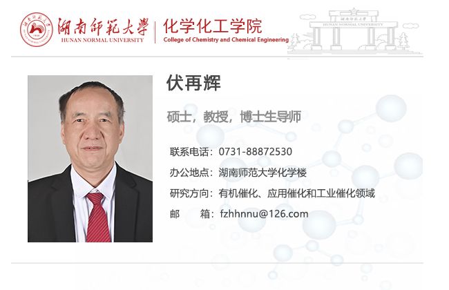伏再辉,54岁,硕士,二级教授,有机化学博士生导师。“石化新材料与资源精细利用”国家地方联合工程实验室副主任,“资源精细化与先进材料”湖南高校重点实验室副主任,精细催化合成研究所副所长。湖南省2011协同创新中心“环境友好与资源高效利用化工新技术”首席专家,学校世承人才计划学术骨干。1988年在中科院大连化学物理研究所催化专业硕士毕业。长期从事有机催化、应用催化和工业催化领域的科研与教学工作,在新型催化材料的分子设计、绿色催化氧化、仿酶催化转化等方面硕果累累,一批原创性的研究成果引起国内外同行的高度关注。先后主持完成5项国家自然科学基金和湖南省自然科学基金重点课题、高等学校博士学位点专项科研基金和湖南省教育厅高校重点实验室平台课题,以及与中石化企业的合作研究课题。发明了一类具有催化分子开关结构特征的新一代烯烃环氧化高效的环境友好催化剂,发展了基于分子氧的选择氧化的绿色光催化反应体系和基于生物质炭磺酸催化木质纤维类生物质水解的高效仿酶催化转化体系。提出的“催化剂活性基团的仿生组装”思想被10000个科学难题编委会收录(湖南省仅3人)。在国际重要刊物J. Catal., Adv. Synth. Catal., Green chem., Applied catalysis B-environ., Appl. Catal. A: Gen., J. Mol. Catal. A: Chem., Ind. Eng. Chem. Res., cellulose 等杂志上发表与催化有关的论文40多篇。获2010年度湖南省自然科学三等奖1项。指导1名硕士研究生获湖南省优秀硕士毕业论文、2名博士研究生获国家奖学金,2名硕士研究生获湖南师范大学优秀硕士毕业论文。目前在有机化学、应用化学、工业催化等方向招收硕士研究生,有机化学方向招收博士研究生。