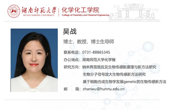 吴战,女,教授,博士生导师。2011年6月在湖南大学化学化工学院分析化学专业获得博士学位。2011年7月至2015年8月在湖南大学化学生物传感与计量学国家重点实验室从事研究工作。2015年9月到2016年12月在美国加州大学洛杉矶分校做博士后研究。2017年1月至今在湖南师范大学任教。一直从事生物传感领域的研究工作,在纳米合成、纳米探针的构建及其在生物传感和活细胞成像中应用方面展开研究工作。在Journalof the American Chemical Society, Analytical Chemistry, ACSnano, Chemical Communications国际期刊发表高水平论文多篇,主持国家级课题四项,获得湖南省自然科学一等奖(排名第三)。