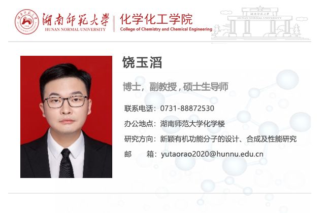 2015年和2020年于湖南师范大学分别获得硕士学位和博士学位(导师:宋建新教授)。2020年8月至今于湖南师范大学任教,从事有机化学教学与科研工作。主要致力于新颖有机功能分子的设计、合成及性能研究。湖南师范大学“世承计划”青年优秀人才。