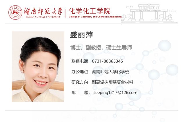 盛丽萍,女,博士,硕士生导师,2017年6月毕业于国防科技大学材料专业博士。研究方向为耐高温树脂基复合材料,研制的耐高温低共熔腈基树脂处于国际领先水平,填补了国内在300-500℃耐温段的低温液相成型树脂空白,主要服务于航空航天、武器装备等领域。目前主持国家自科1项、省重点1项、省自科1项、军口横向1项、地方高校2项,参与其他项目多项。现已发表SCI论文10余篇,申请及授权专利共10项。