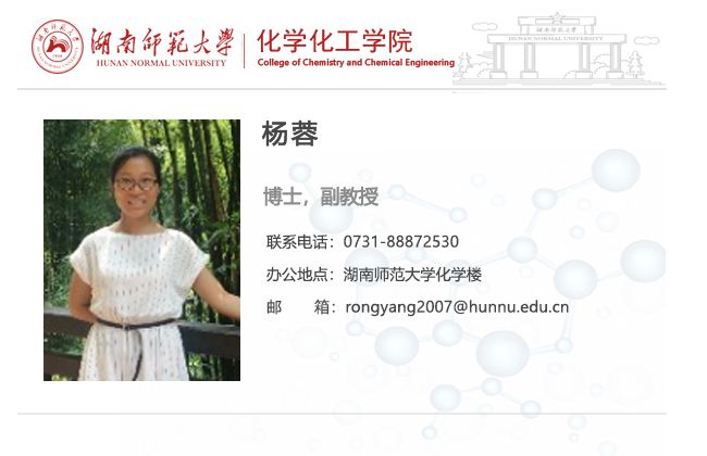 杨蓉,女,1982年2月生,籍贯湖南省长沙市,汉族,湖南师范大学讲师。2000-2004年在四川大学化工学院制药工程专业获得学士学位,2004-2007年在四川大学化工学院生物化工专业获得硕士学位,2007年起在湖南师范大学任教至今,主要承担制药工程专业的《药物制剂工程》、《制药设备与工艺设计》、《药物制剂工程实验》等课程的教学工作,曾荣获2012-2013年度、2016-2017年度湖南师范大学教学优秀奖和2017-2018年度湖南师范大学树达学院教学优秀奖。教学研究工作方面主要从事高等院校工科教学研究工作,主持并完成湖南省省级教学改革研究项目一项,近年发表教研论文6篇,其中5篇发表在北大中文核心期刊《化学教育》上,1篇发表在国家化学教育权威期刊《Journal of Chemical Education》上。科研方面主要从事天然产物有效成分分离和分析方法的研究工作,主持并在研湖南省中医药科研计划一项,主持并完成校级青年基金一项,参与国家自然科学基金面上项目一项、湖南省科技厅项目一项。