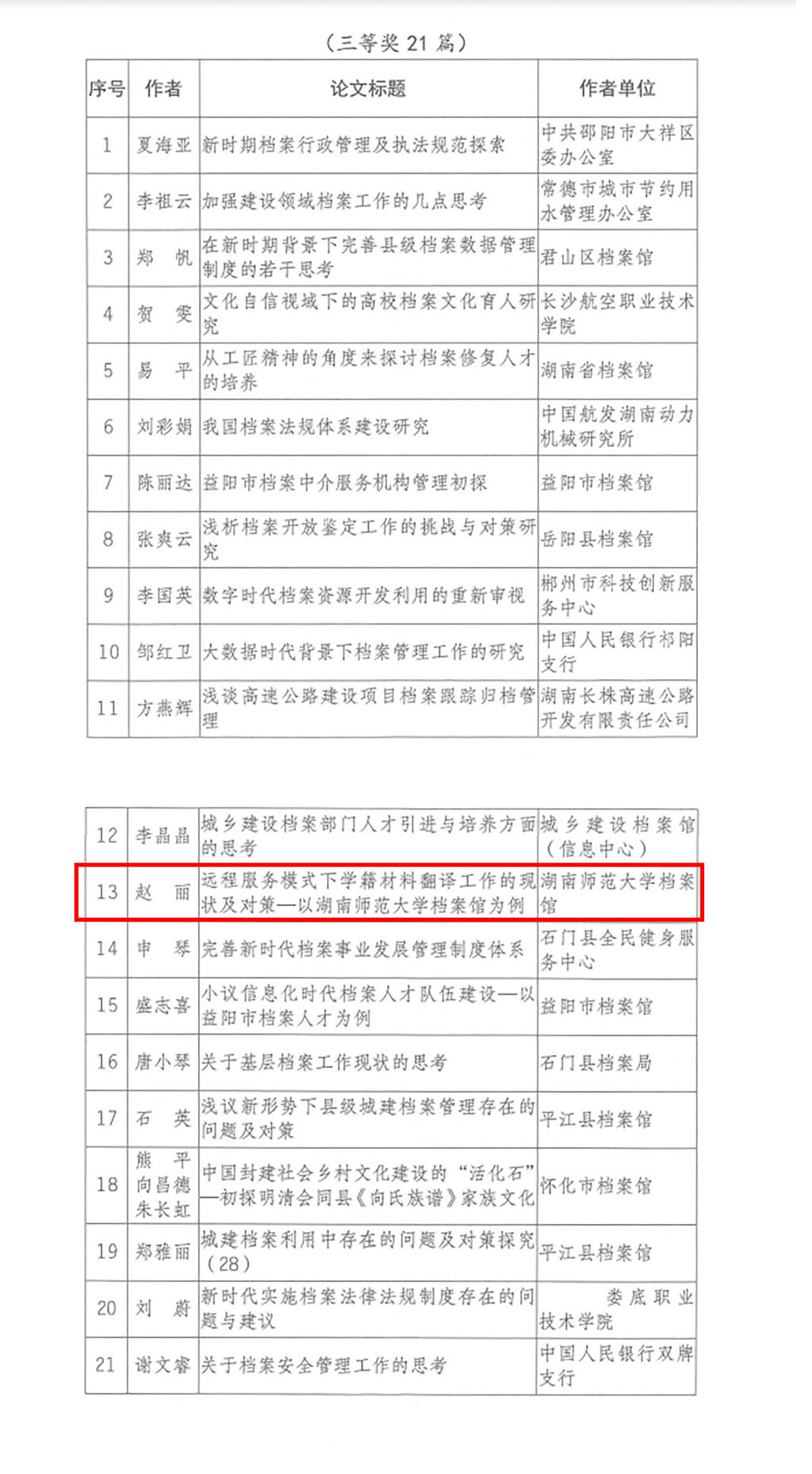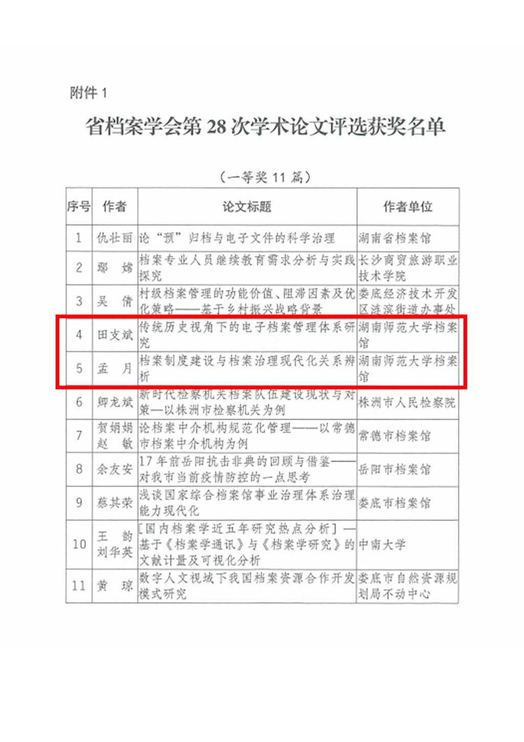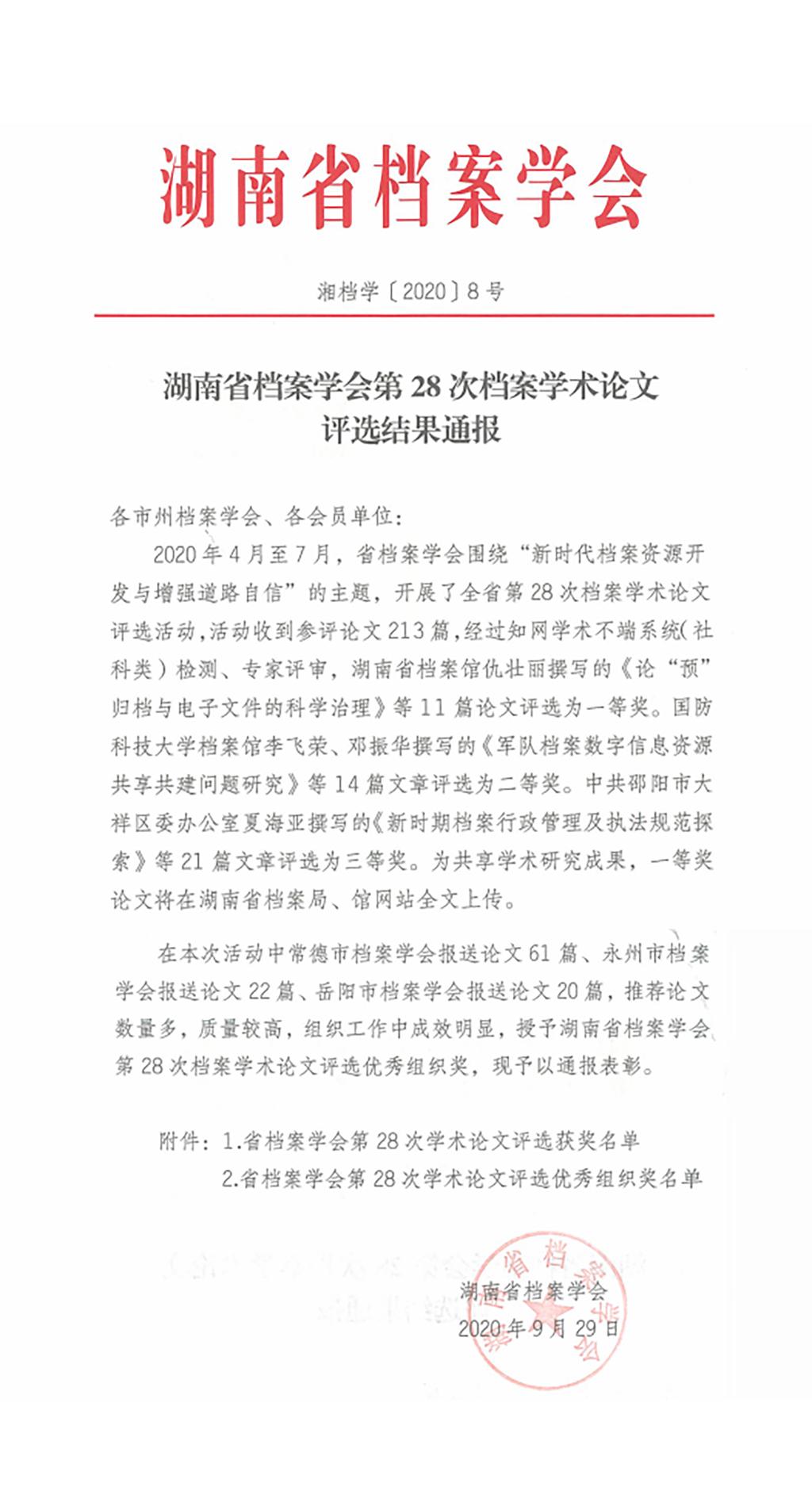 近日,由湖南省档案学会主办的全省第28次档案学术论文评选结果揭晓,我校档案馆选送的3篇论文荣获2个一等奖和1个三等奖。