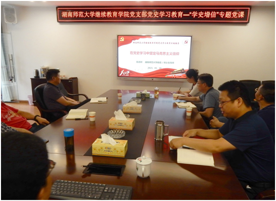 5月10日下午,继续教育学院党支部举行党史学习教育“学史增信”专题学习研讨,邀请马克思主义学院陈德祥教授为大家做辅导报告。院党支部书记吴跃飞主持会议,全体党员和教职工参加了学习。