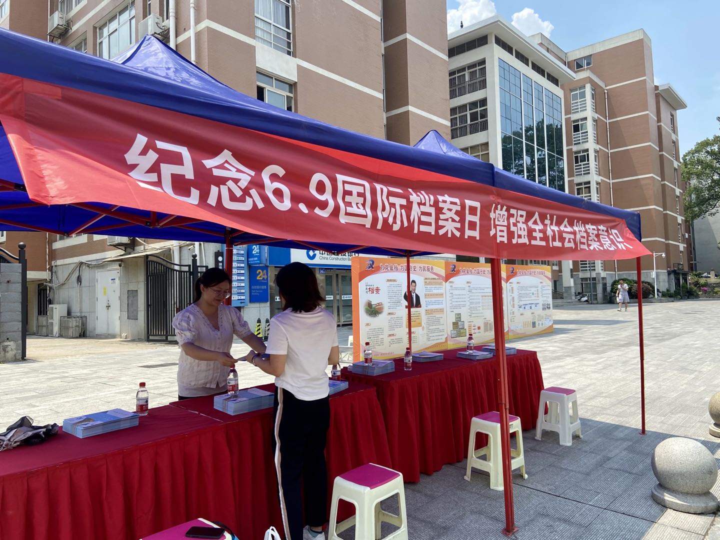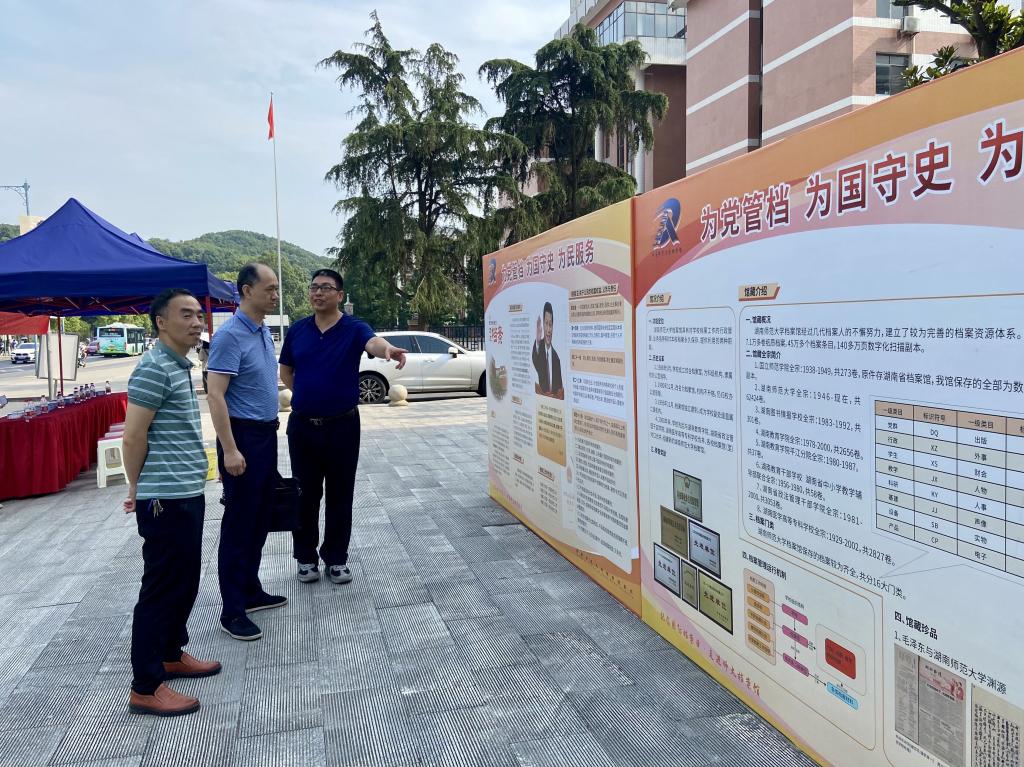 此次活动,档案馆精心设计展览内容,在档案基本知识、学校档案馆馆况和馆藏介绍、档案利用服务方面以图文并茂的形式进行展示。档案馆充分挖掘馆藏档案资源,分模块设计并首次展示了“毛泽东与湖师大渊源”、“国师档案”、“党和国家领导人题词”等档案珍品图片。活动现场,馆长李彦率全馆职工冒着高温酷暑,通过设立咨询台、悬挂横幅、摆放宣传展板、发放资料等方式,热情地为学校师生、社会人士进行现场咨询解答,重点解读了数字档案馆公共服务平台、档案利用服务项目和服务方式、档案远程服务、档案珍品背后的故事等内容。