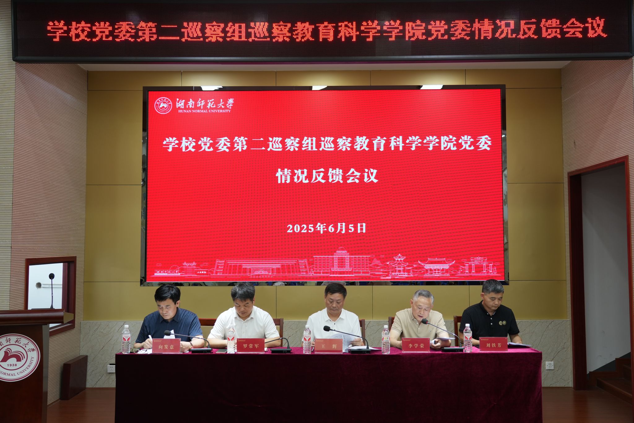 根据学校党委巡察工作的统一部署,2025年6月5日下午,湖南师范大学党委第二巡察组向教育科学学院党委反馈巡察情况。校党委委员、副校长王辉,党委办、党委巡察办主任罗常军,党委第二巡察组组长李学荣出席会议,教育科学学院党委书记向发意主持会议。