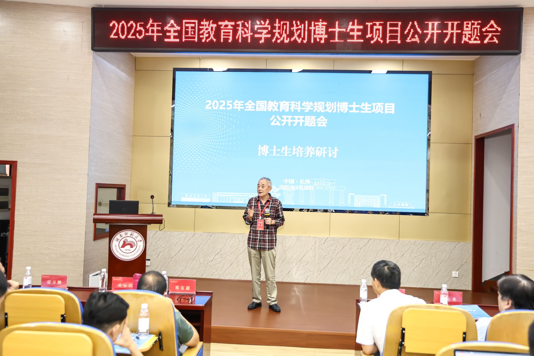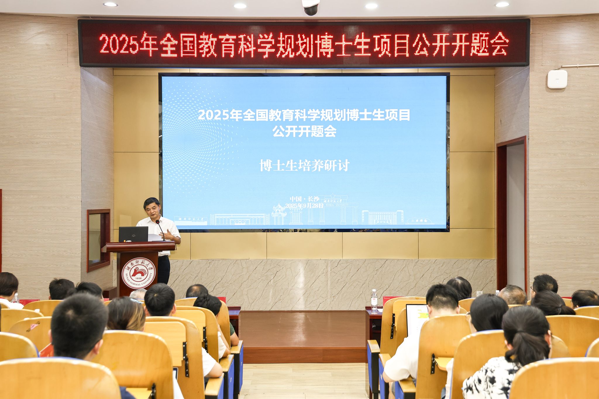 (通讯员 樊杰)9月28日,全国教育科学规划博士生项目公开开题会在湖南师范大学举行。全国教育科学规划今年首次设立博士生项目,此举是贯彻落实《教育强国建设规划纲要(2024-2035年)》和三年行动计划的创新举措,旨在先行先试,探索学术人才培养新机制,推动中国教育学转型发展。会议由全国教育科学规划办公室常务副主任邓友超和湖南师范大学教育科学学院院长刘铁芳主持。湖南师范大学副校长潘安练,湖南省教育科学研究院院长杨颖、湖南师范大学教育科学学院党委书记向发意以及34位专家学者参加会议。