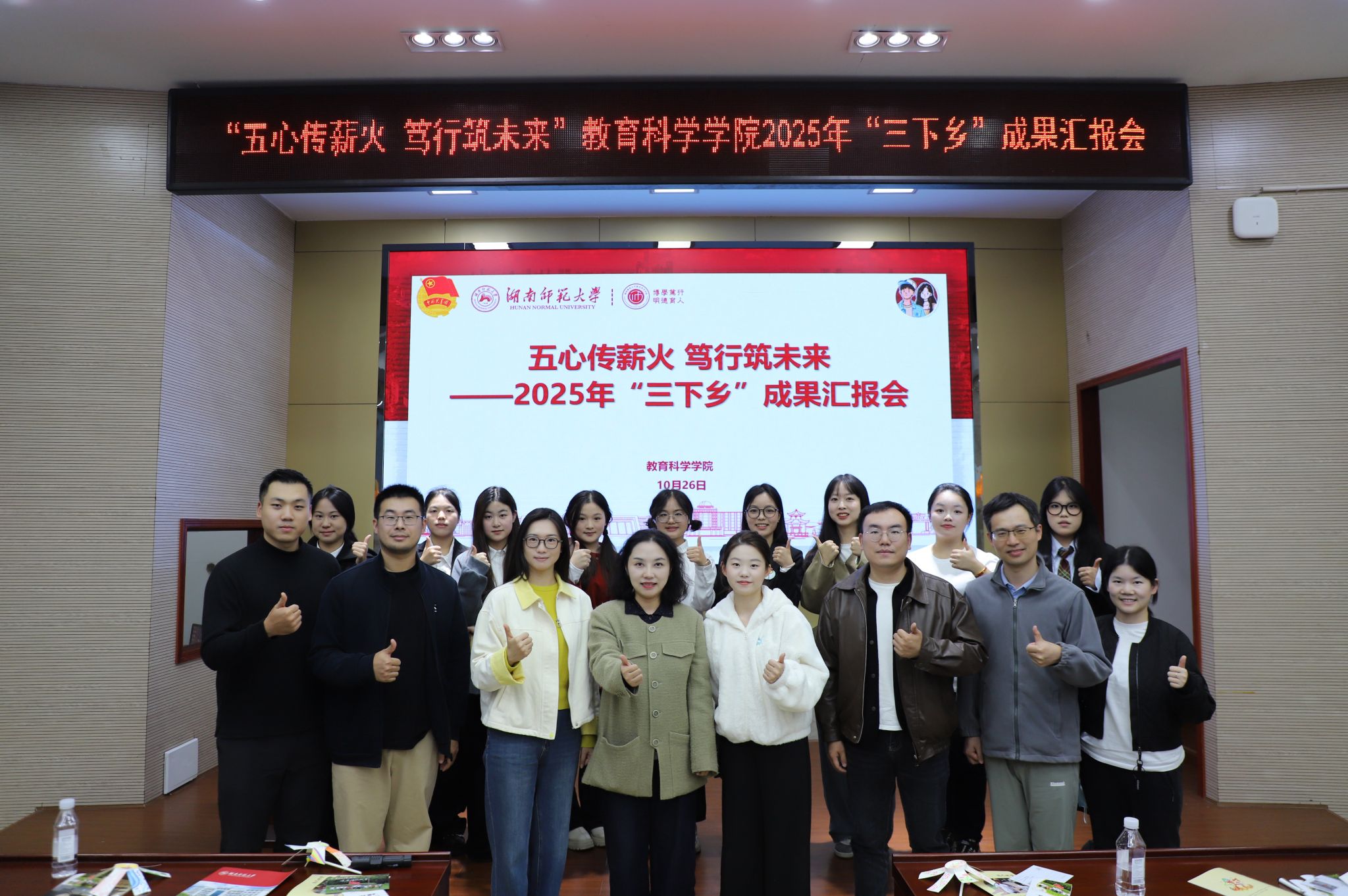 (通讯员 卢梓晴 吕海霞 张秀玲)10月26日晚,教育科学学院(以下简称“教科院”)于院101报告厅举行了“五心传薪火 笃行筑未来”2025年“三下乡”暑期社会实践成果汇报会。院党委副书记林峻、新东方家庭教育产品研发专员黄靓昕、新东方家庭教育市场渠道高级专员鄢正豪、实践团指导老师代表谌衡、罗帅、学工办主任李雯婕、院团委书记谭梦及学工办辅导员吴凡、张馨予参与汇报会。
