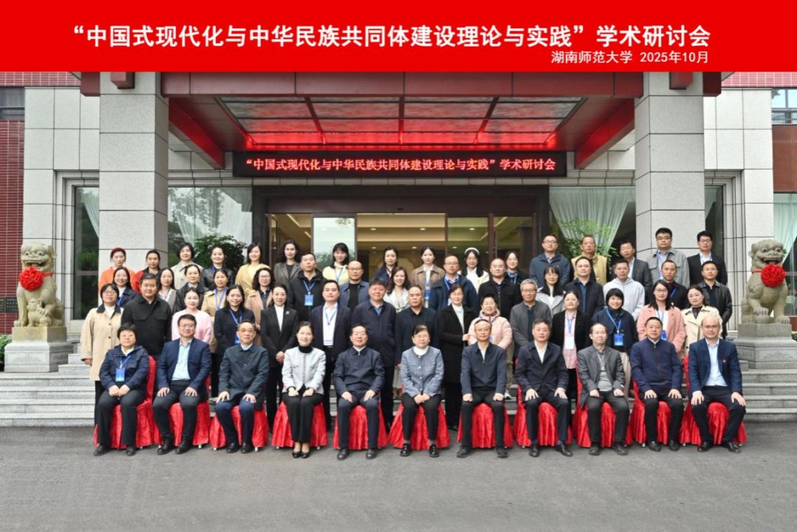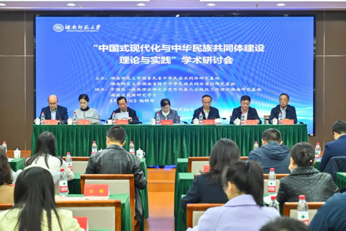 (通讯员 吕依婷 杜安安 陈星宇)10月26日至27日,由湖南师范大学国家民委中华民族共同体研究基地、湖南省铸牢中华民族共同体意识研究基地(以下简称为“研究基地”)主办,中国统一战线理论研究会党外代表人士统战工作理论湖南研究基地、湖南省民族研究学会、《民族论坛》编辑部协办的“中国式现代化与中华民族共同体建设理论与实践”学术研讨会在我校举办。国家民委理论研究司二级巡视员陈晓嫚,省委统战部副部长、省民宗委党组书记、主任覃万成,省社科联党组书记、副主席胡代松,我校党委委员、副校长王辉,党委副书记段巍,研究基地首席专家、省民族研究学会会长郑大华出席开幕式。校党委委员、统战部部长、研究基地副主任杨念主持开幕式。