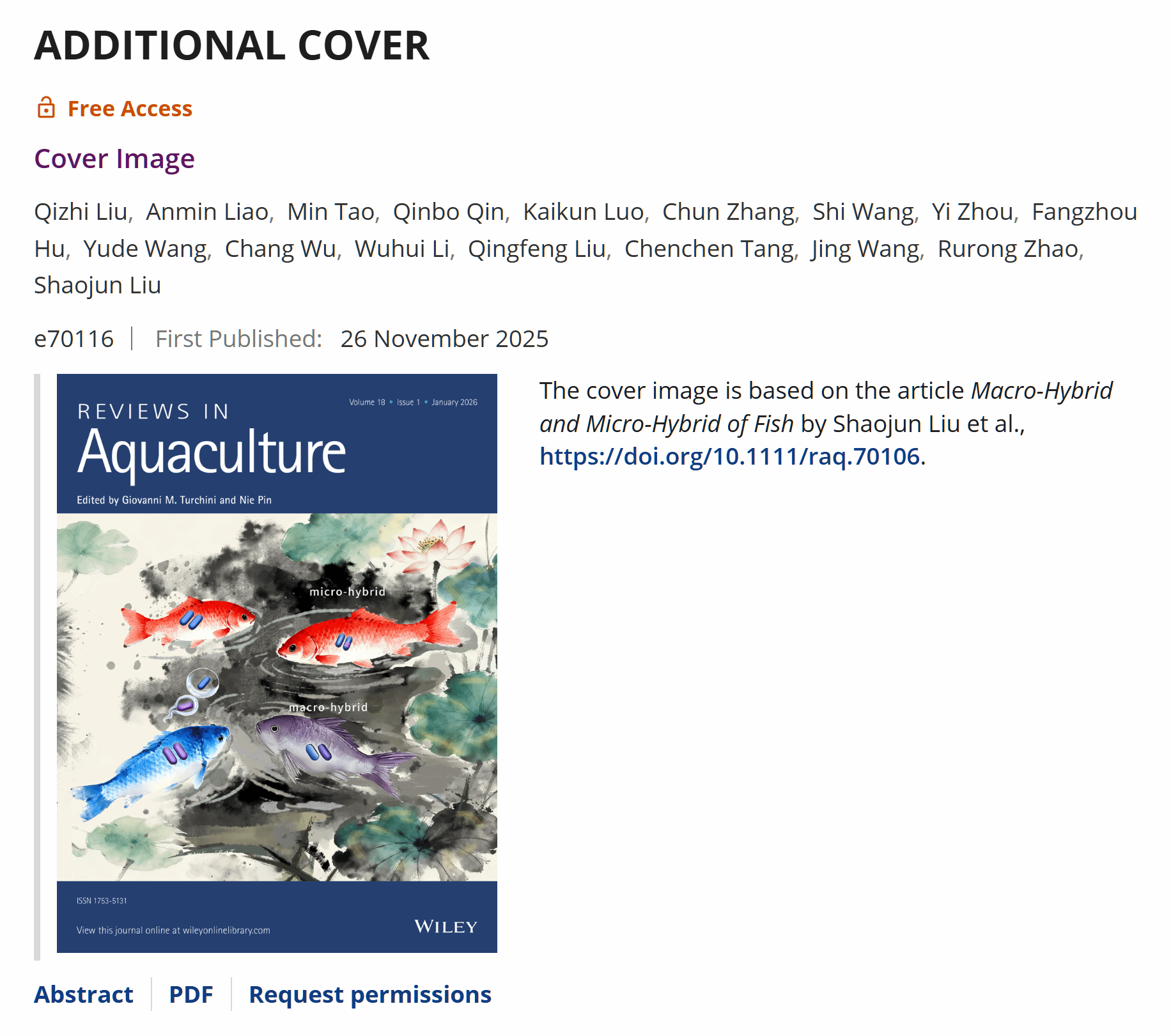 (供稿 生命科学学院)我校刘少军院士团队首次系统提出鱼类大杂交和微杂交理论和技术,为鱼类遗传育种学提供了新理论、新技术, 用这些技术研制了一批优良鱼类,该团队以“鱼类大杂交和微杂交”为题的文章发表在近期Reviews in Aquaculture,并入选当期附加封面文章。刘少军院士为该文的通讯作者,刘启智老师和博士生廖安民为该文的共同第一作者。