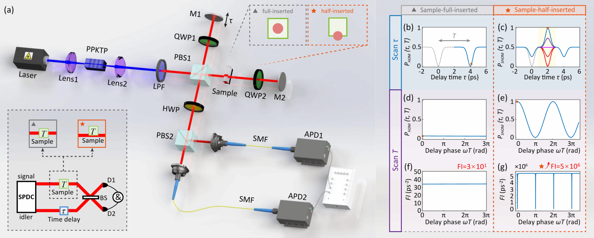 研究团队提出了一种样品半插入型HOM(SHOM)干涉仪,即只让一半的光子通过样本,另外一半沿原路通过。这种巧妙地结构设计能够产生“凹陷-凸起-凹陷”型的干涉条纹,可将Fisher信息提高五个数量级,从而显著减少测量次数,快速实现高精度测量。研究团队在实验上使用了O(107)个光子,达到的平均精度为4.09 纳米(13.63 阿秒),平均准确度为1.22 纳米(4.07阿秒)。与之前报道的HOM方案相比,光子数减少了四个数量级,重复试验次数减少了约175倍。此研究为量子光学相干层析、微尺度制造中的表面轮廓成像、以及光学镀膜与半导体工艺中的薄膜厚度在线监控的应用打通了一条富有吸引力的新途径。