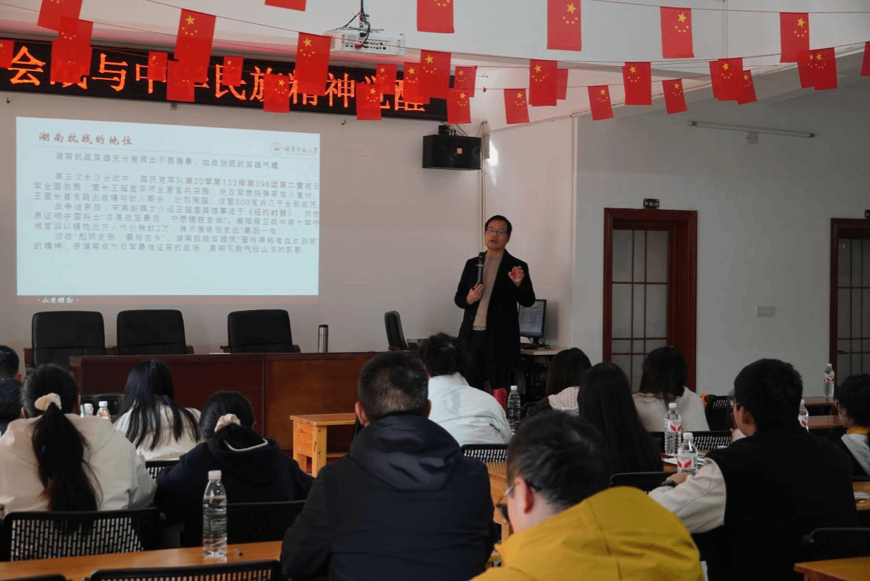 郭辉表示,湖南是连接大后方(川滇黔)和江南各省、两广的重要通道,是中日双方抗战时期的必争之地,对抗日战争的胜利作出了特殊贡献。他从湖南抗战的地位和抗战研究的实地调研两个方面,用丰富翔实的史料深入浅出地讲述了湖南抗战历史与长沙会战全貌、中国共产党在湖南引领的抗日救亡运动高潮、世界反法西斯同盟在湖南协作抗日的壮举、湖湘各族人民为抗日战争胜利作出的巨大贡献,以及实地走访抗战遗址遗迹采集相关资料的历程和感悟。郭辉认为,留存于世的抗战遗址遗迹是进行爱国主义教育的重要纪念空间,要从国际视野和空间概念来认识中国抗战、湖南抗战的重大历史意义,勉励青年学子加强抗日战争史研究,利用好我校麓山忠烈祠这一重要抗战文化阵地,争做伟大抗战精神的精彩讲述者、生动诠释者与忠实传播者。