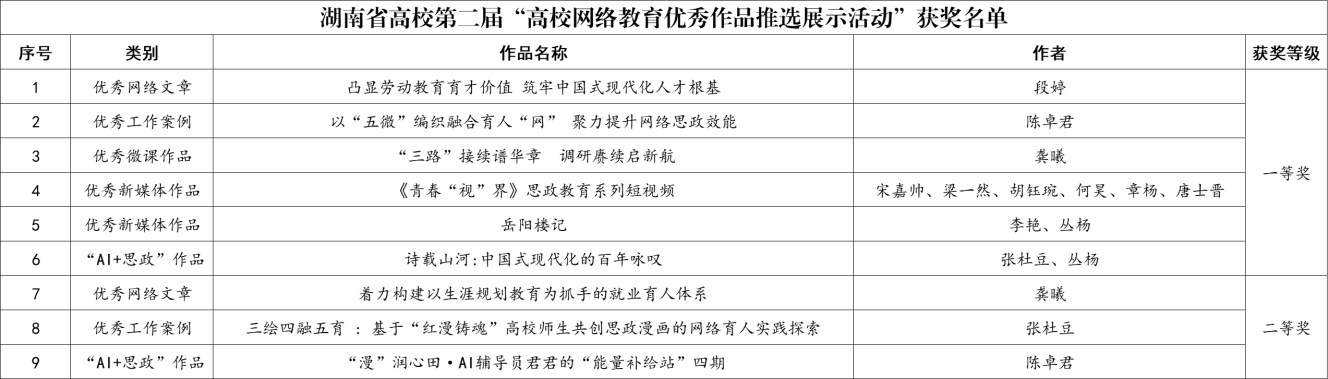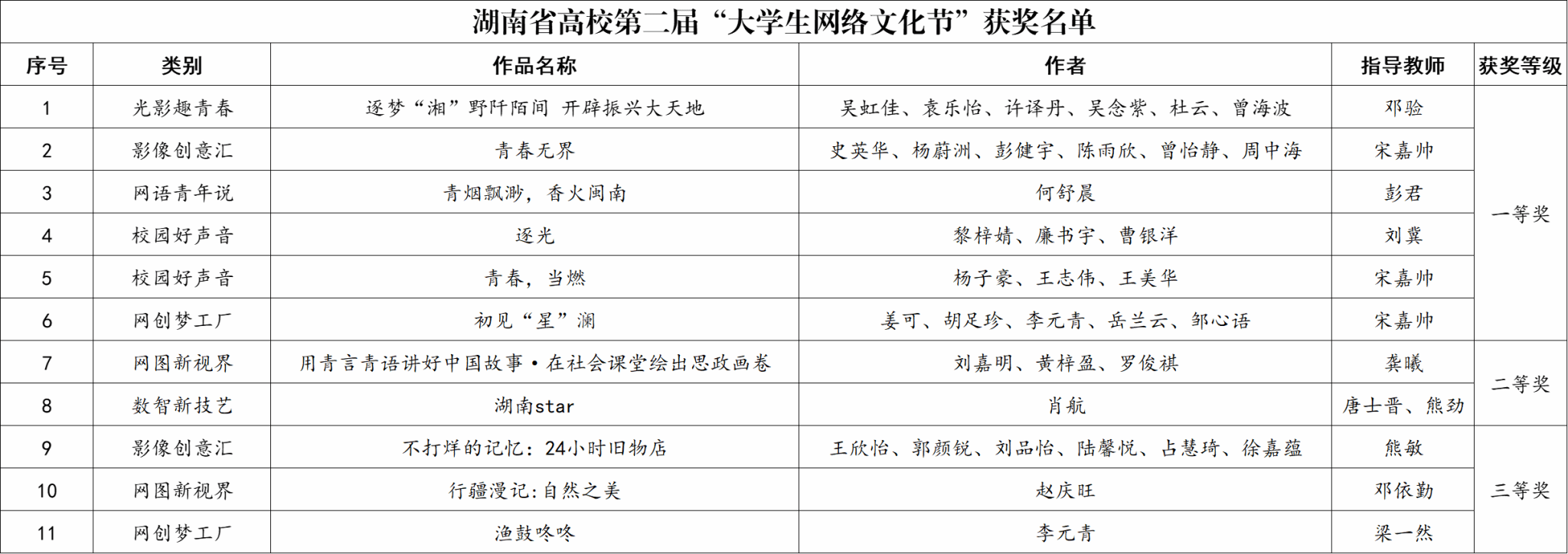 (通讯员 何楚静 王欣悦)近日,由中共湖南省委网络安全和信息化委员会办公室、中共湖南省委教育工作委员会、湖南省教育厅主办的湖南省高校第二届“一节一推选”活动作品评选结果公布,我校共20项作品成功入选。其中,“大学生网络文化节”获一等奖6项、二等奖2项、三等奖3项;“高校网络教育优秀作品推选展示活动”获一等奖6项、二等奖3项。